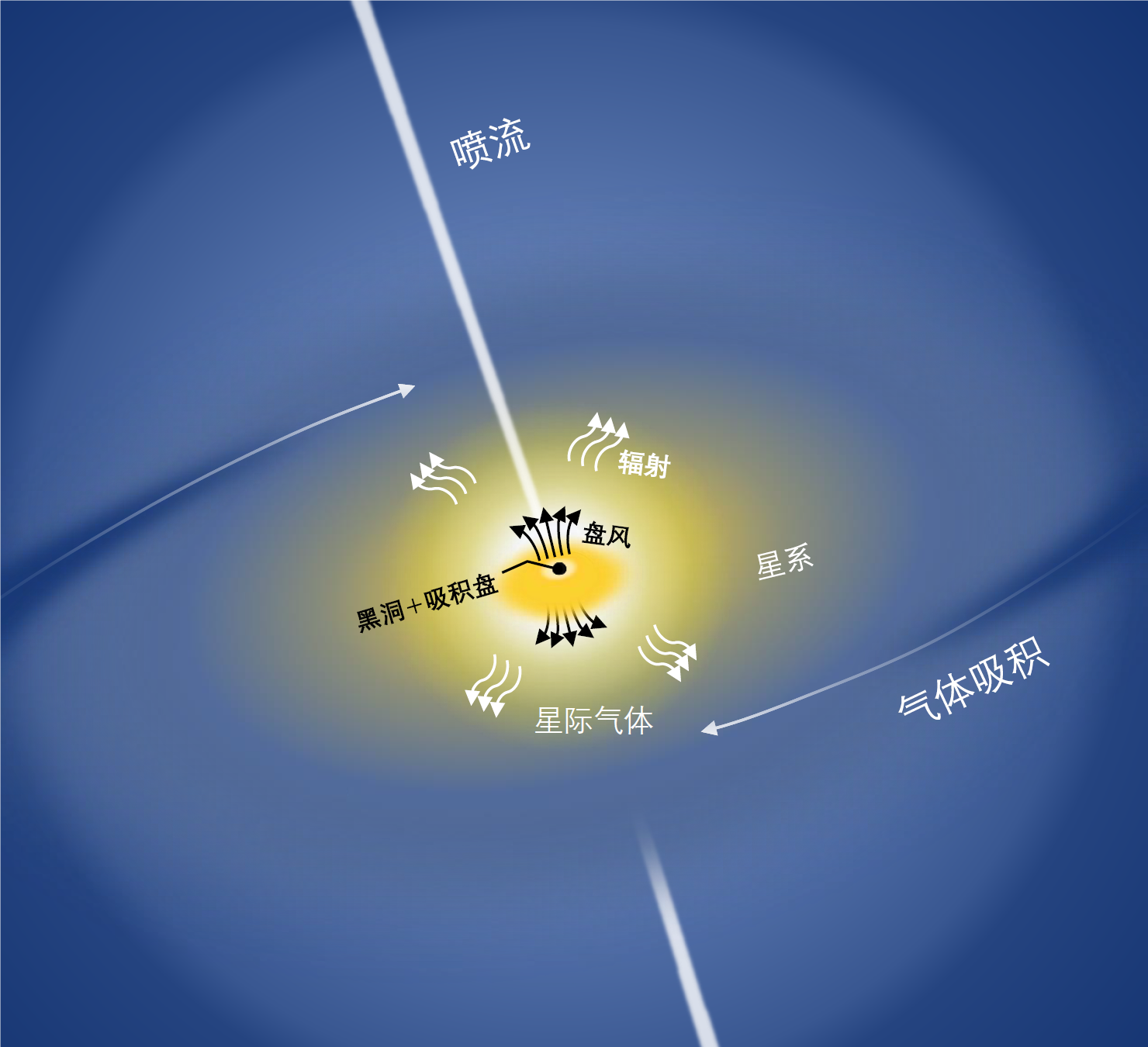 宇宙中几乎每个星系中心都存在一个超大黑洞,黑洞周围的气体在黑洞引力的作用下会往黑洞下落形成吸积盘,在此过程中会发出强烈的辐射和物质外流(包括喷流和风)。这样的星系核因此被称为“活动星系核”。这些辐射和物质外流在星系中能够传播得很远,并与星系中的星际气体发生相互作用,改变气体的温度、密度、分布等物理状态。气体物理状态的改变会影响恒星形成的快慢以及多少,因此影响整个星系的演化,这就是所谓的“活动星系核反馈”,目前被广泛认为可能是解决星系演化研究中遇到的一系列疑难问题的关键,是目前天体物理研究中最前沿的课题之一。