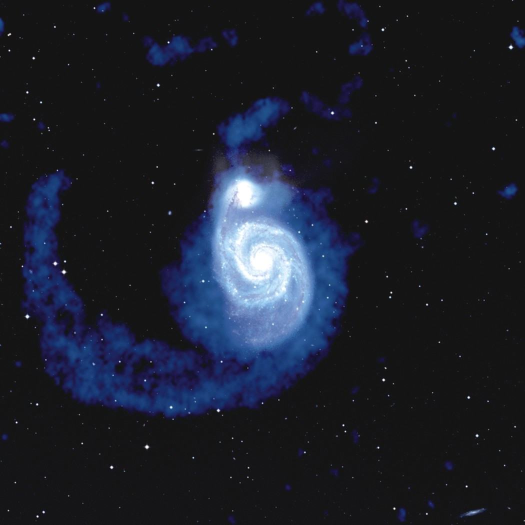 星系的形成和演化是本世纪最关键的天体物理课题之一。氢是宇宙最丰富的元素,中性氢(HI)是星系的基本组成成分,星系的形成是由中性氢云团在引力作用下塌缩而开始的,而星系演化的过程就是中性气体不断冷却变密形成分子气体进而塌缩形成恒星的过程。因此,研究宇宙中中性氢的含量和分布及其随时间的演化是我们了解星系成长的物理过程的主要手段。另一方面,中性氢遍布于整个星系,尤其是在星系外围,已经看不到星光的地方,还有大量中性氢气体。通过中性氢观测可以看到很多肉眼看不到的现象。中性氢分布极易受外力的影响,分析中性氢气体的运动规律可以揭示其背后控制气体运动的秘密。例如看到下图中旋涡星系的旋臂结构我们知道星系在旋转。但旋转得快的时候,如果没有足够的引力,气体应该被离心力甩出星系。可是观测却不是这样的。因此天文学家猜想星系中存在一些看不见的物质,提供了额外的引力,从而保证了星系中的中性氢气体不散开。这些看不见的物质就是“暗物质”。中性氢动力学的研究目的就是通过定量分析气体围绕星系转动的旋转曲线来揭示星系中的暗物质分布。此外,在星系团环境中通过中性氢观测可以探测到星系相互作用遗留下来的痕迹,揭示外部环境对星系演化的作用。