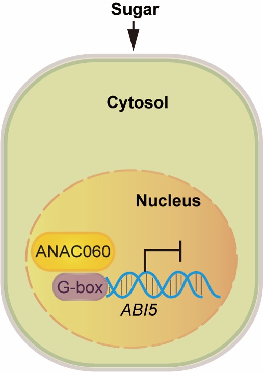 研究人员在参与ABA响应、ABA激活的信号途径的ANAC060靶基因中,发现了ABA信号的核心转录因子ABI5。系统的生物化学以及分子生物学研究结果表明,ANAC060特异地结合到ABI5启动子的G-box元件上并抑制ABI5的表达。遗传分析结果表明,ANAC060对ABI5的抑制作用降低了糖和ABA的敏感性。总之,ANAC060抑制植物糖-ABA级联途径的分子机理是ANAC060直接负调控ABI5的表达。