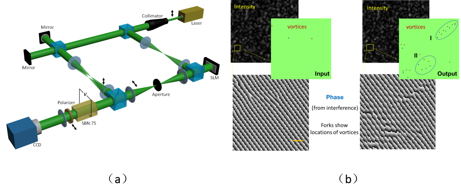 在该光子BKT实验中,研究人员以输入光波的随机性来模拟一个二维系统的“温度”。这可以通过对入射光波进行随机相位编码来实现:“温度”越高意味着随机相位的相干长度越短。如图1a所,把经过随机相位编码的光束输入到一个施加电场的光折变晶体SBN中,并把其偏振态调整至与晶体光轴一致,在外加电场的作用下,光在晶体中传播会发生自散焦或自聚焦效应,这个过程与二维系统波函数随时间的演化一样,可以非线性薛定谔方程来描述。通过对晶体输出面的光场进行数字全息成像,可以重构出其相位分布,进而确定所有涡旋的位置和数量(图1b)。