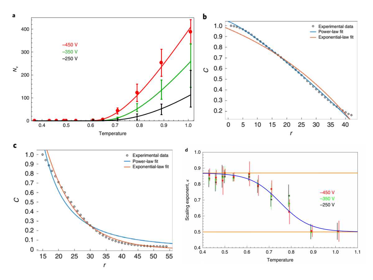 主要实验测量结果如图2所示。图2a显示的是在不同外加负电压情况下,输出散斑场中新生自由涡旋的数量与输入场的“温度”之间的函数关系,实验数据与BKT理论预测完全一致:当系统的“温度”低于某个临界温度时,没有自由涡旋的产生,此时输出的散斑场保持准长程有序,其关联函数满足幂律衰减(图2b)。当“温度”高于临界值后,系统的熵增加,则倾向于产生了新的自由涡旋(因为涡旋的能量与熵一样,都是自然对数函数)。随着“温度”的升高,涡旋数量增加,涡旋导致场的扭曲,系统的相干性遭到破坏,其关联函数退化为指数衰减(图2c)。通过计算散斑场的关联指数清楚地看到系统在这两个“态”之间的转化(图2d)。