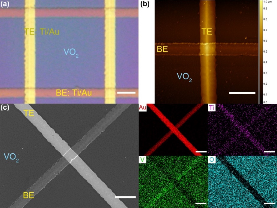 图1. 交叉点结构TiAu/VO2/TiAu选择器俯视图。底电极(Bottom electrodes, BE)和顶电极(Top electrodes, TE)线宽为5μm,图中比例尺为10μm。