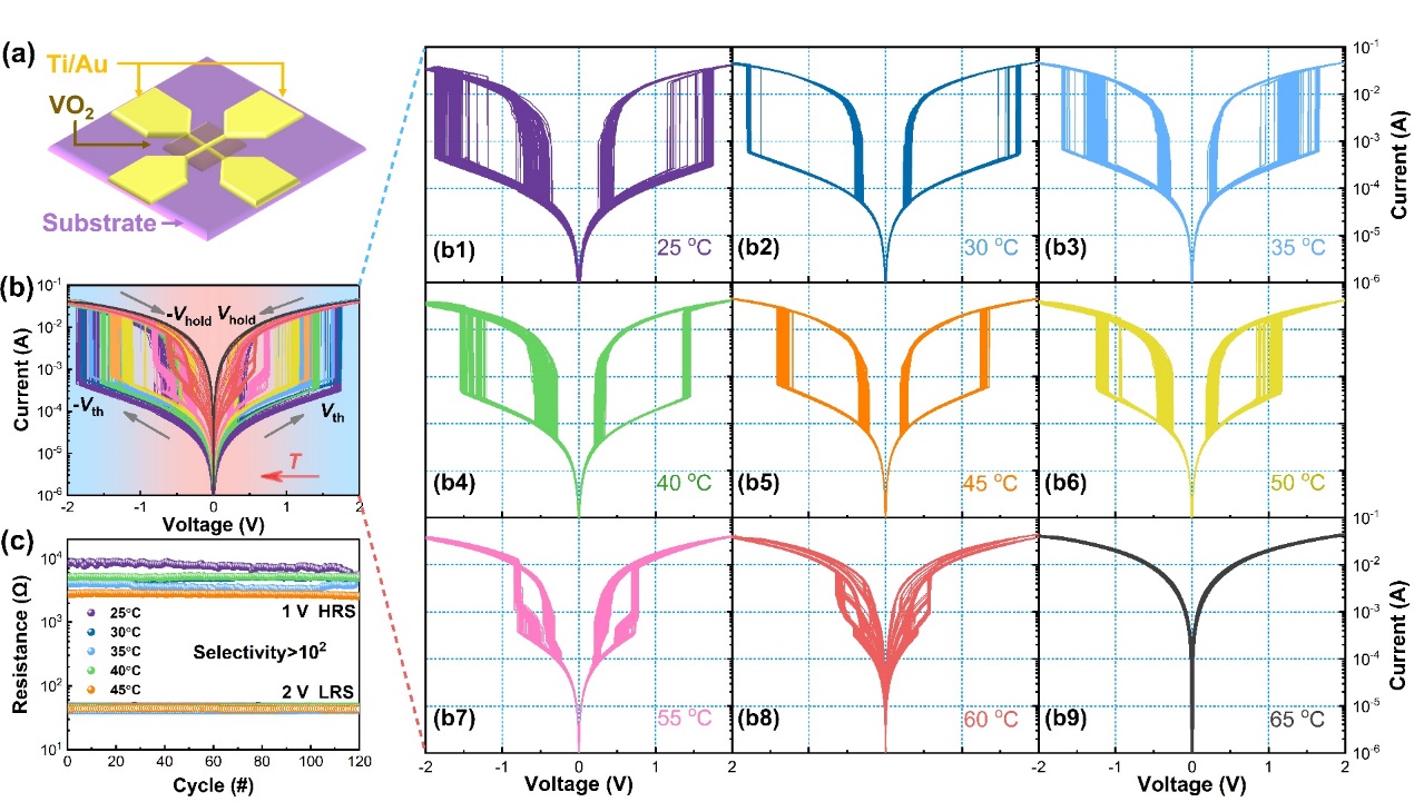 图2. TiAu/VO2/TiAu选择器随温度变化的阈值切换行为,随着外界温度升高,激活VO2相变所需焦耳热降低,因此阈值电压呈降低趋势。