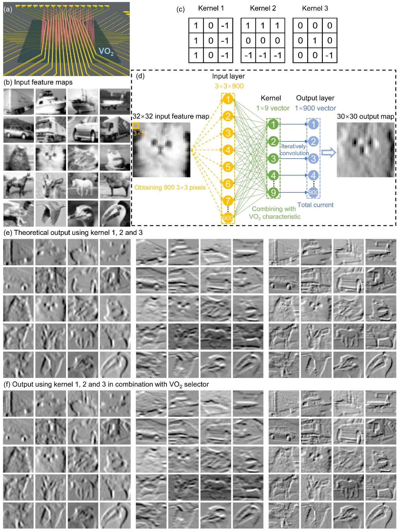 图3. 基于VO2器件的光学卷积引擎。(a) VO2 photo-selector模型。(b) 从CIFAR-10数据集中选择的输入要素图,在光学卷积引擎中,输入图转换为不同的电压幅度。(c) 三个具有3×3像素的卷积核。 (d) 卷积神经网络的示意图。 (e) 使用卷积核和输入图进行卷积运算后的理论输出图。 (f) 使用卷积核结合VO2 photo-selector特性进行卷积运算后的输出图。