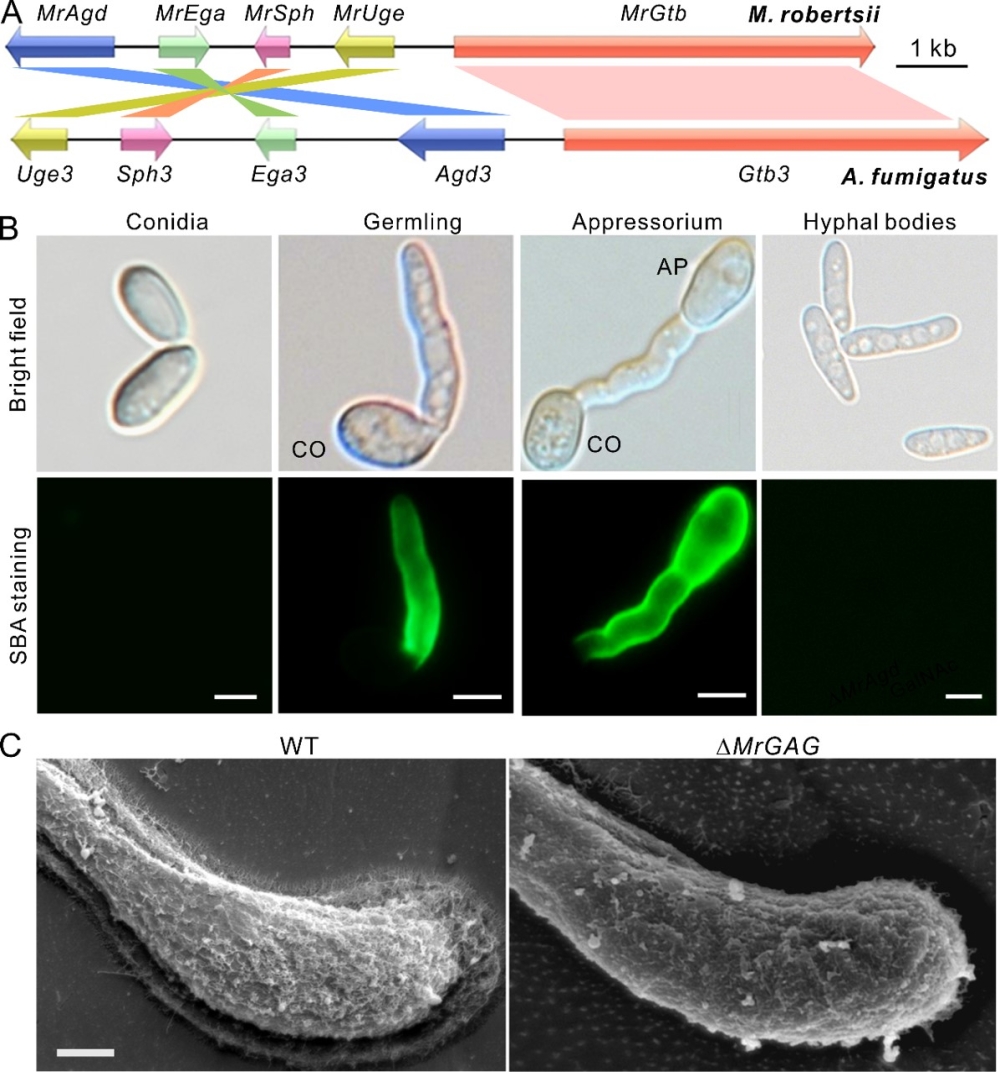 该研究发现,绿僵菌中存在一个与曲霉菌保守的、由5个基因组成的基因簇,负责合成胞外多糖乙酰半乳糖胺半乳聚糖(galactosaminogalactan, GAG)。该多糖由半乳糖、半乳糖胺和N-乙酰半乳糖胺通过α-1,4糖苷键连接而成。通过对该基因簇全部基因及各个单基因进行敲除后,生物化学、质谱及昆虫生物测定等分析证明,绿僵菌通过该基因簇合成部分去乙酰化的GAG,主要在附着胞形成及液体培养的菌丝阶段合成。与人类病原真菌烟曲霉系统感染时需要合成GAG多糖不同,绿僵菌细胞侵入昆虫体内后不会合成GAG。电镜观察发现,绿僵菌基因突变株的附着胞分化不受影响,但其表面的粘液层消失、孢子粘着及穿透昆虫体壁能力显著下降,从而显著影响绿僵菌体表感染的杀虫毒力。与野生型菌株相比,突变株粘液层的缺失可导致附着胞阶段多种蛋白的差异表达,包括与昆虫体壁降解相关的蛋白酶、几丁质酶和脂酶等。另外发现,GAG合成缺失突变株丧失了在疏水表面形成生物膜,以及液体培养时形成菌丝球的能力。论文研究成果对于促进理解杀虫真菌的致病机理具有良好的推动作用,也揭示了保守基因簇合成的GAG多糖在不同真菌中发挥着相似或显著不同的生物学功能。