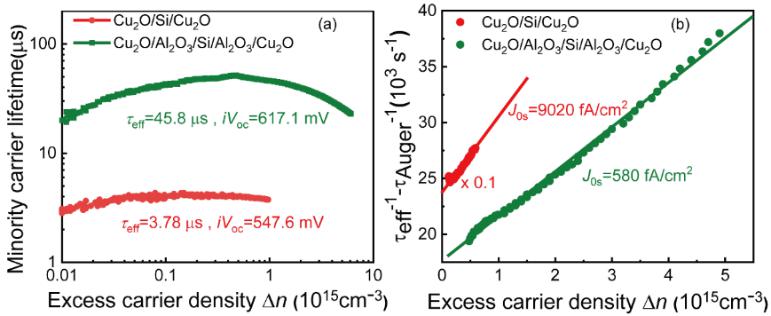 图1. p型Si片上沉积Cu2O和Al2O3/Cu2O叠层薄膜后的(a)少子寿命随注入浓度的关系,以及(b)饱和电流密度(J0S)。