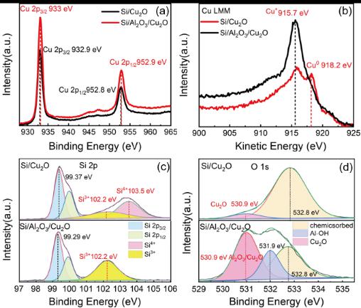 图2. p-Si和p-Si/Al2O3衬底上制备Cu2O薄膜的Cu 2p, Cu LMM, Si 2p 以及O 1s的XPS图谱。