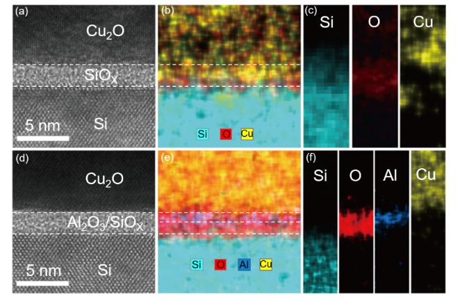 图3. p-Si和p-Si/Al2O3衬底上制备Cu2O薄膜截面的高分辨透射电子显微镜照片以及相应的能谱分析。