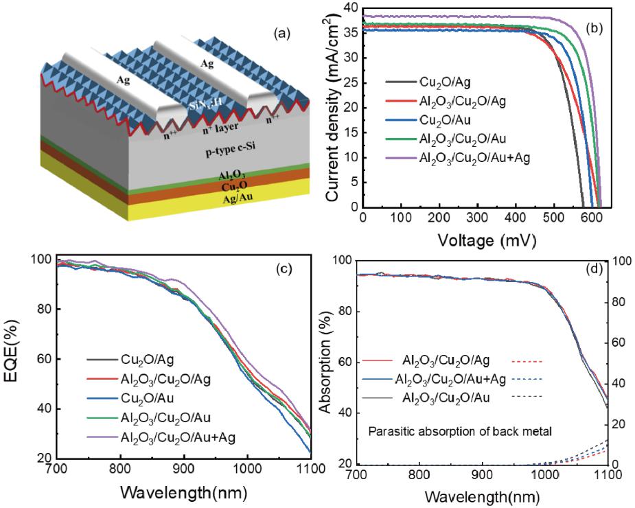图4. (a)p-Si/Al2O3/Cu2O背接触异质电池示意图,以及不同叠层器件的(b)电流密度-电压(J-V)和(c)外量子效率(EQE)曲线。(d)在不同金属背电极下,体硅和电极的光吸收特性。