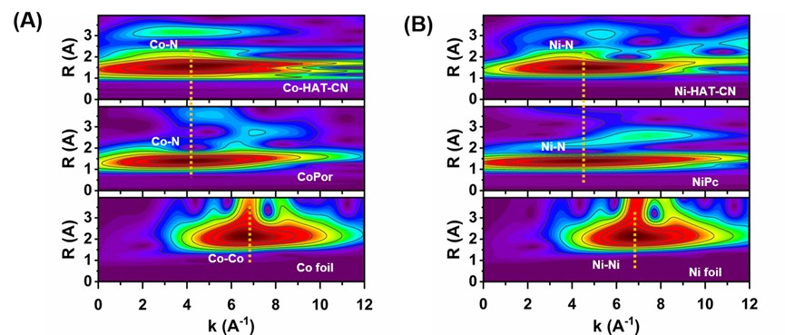 在此背景下,该团队整合MOF和COF的优势构建了具有双催化中心(金属-N4和金属-N2)的新型金属有机聚合物(Co-HAT-CN和Ni-HAT-CN)来催化ORR和OER(图1)。该催化剂利用不同的金属离子和催化位点作为催化中心,具有可调的催化活性和选择性。通过对局部原子和电子结构的研究发现,Co-N与Ni-N的配位数均为3.9,表明存在M-N4和M-N2(M=Co,Ni)双位点,验证了M-N4和M-N2的构型(图2)。在饱和氧的0.1 M KOH溶液中,Co-HTA-CN的半波电位(E1/2=0.80 V)与Pt/C相接近,Tafel斜率最低为74 mV dec-1,表明其快速动力学性能。在1.0 M KOH溶液中Co-HTA-CN的OER(Ej10=350 mV)活性较商业RuO2更好,且具有更低的Tafel斜率(24 mV dec-1)。此外,通过验证催化剂的选择性与不同位点的催化作用,证明了Co-HAT-CN和Ni-HAT-CN分别通过四电子、二电子途径催化ORR,Ni-HAT-CN过氧化氢选择性超过90%。催化剂通过M-N4位点催化ORR,M-N4和M-N2位点的共同作用催化OER。这项工作是统一MOF高导电性和COF高稳定性的优点作为电催化剂的突出例子,为多孔电催化剂材料的设计提供了新的思路。
