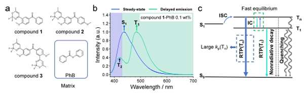 图1. BPBF2-PhB双组分材料的上转换磷光现象。a) 三个BPBF2分子的化学结构以及有机小分子基体苯甲酸苯酯的化学结构;b) 1-PhB-0.1%粉末室温下的稳态发射光谱和延迟发射光谱(1 ms延迟)以及标注的发射谱激发态来源;c) 提出的上转换磷光发射机理。
