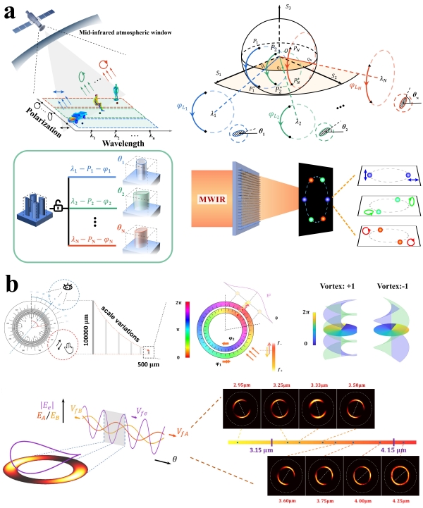 中波红外(MWIR)作为“分子指纹”密集区,在气体检测、航天遥感、空间通信、红外对抗等应用中发挥重要作用。对中波红外光子波长和偏振等维度的解析是对目标进行探测与识别的重要手段。相比传统中波红外器件,超表面器件在波长、偏振维度调控方面具有巨大潜力,该技术为亚波长尺度下独立操纵光子的多个维度属性提供了强大而灵活的器件平台。
