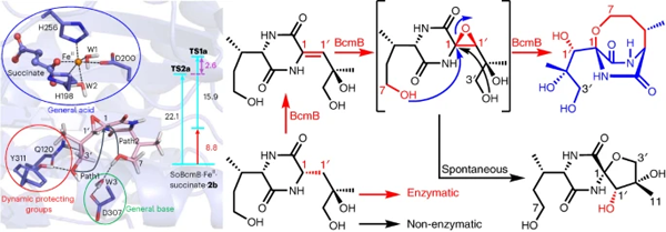 在先前的研究工作中,唐功利研究员课题组采用体外重构所有酶催化反应的策略,全面解析了双环霉素的生物合成途径(Angew. Chem. Int. Ed. 2018, 57, 719.),发现八元氧杂桥环的构建由非血红素FeII/α-酮戊二酸依赖的双加氧酶BcmB负责完成。在本项研究中,唐功利课题组与中国科学院深圳先进技术研究院周佳海研究员课题组、南京大学化学化工学院梁勇教授课题组和中国科学院分子植物卓越创新中心杨晟研究员课题组合作,通过体外酶催化分析、化学合成实验、蛋白晶体结构解析、定点突变、以及理论计算等研究,深入阐明了双环霉素八元氧杂桥环形成的具体机制(图1)。作者发现多功能氧化酶BcmB催化连续的脱氢、环氧化、以及分子内关环(环化)反应构建双环霉素的八元氧杂桥环。更重要的是,在这酶催化的分子内关环反应中,存在一种八元环和五元环成环竞争的现象,而酶的关键残基通过非共价保护的机制使得化学上易于发生的五元环化反应逆转为了较难发生的八元环化反应。该研究工作丰富了我们对天然酶精准控制成环选择性的认识,也为氧杂中环体系的选择性构建提供了新的启示。