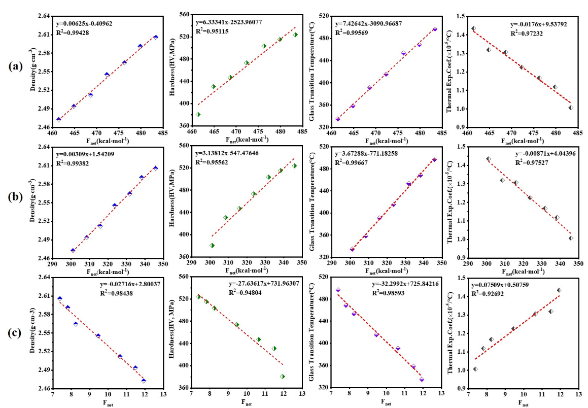 图1以磷酸铝玻璃的(a)配位数(CN)、(b) Qn、(c)环尺寸作为结构输入所建立的定量结构-性能关系模型。从左到右列为结构描述符Fnet分别与实验密度、硬度、玻璃化转变温度和热膨胀系数的关系。