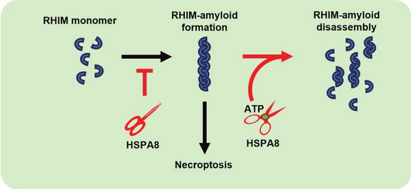 综上所述,该项工作报道了哺乳动物中的第一个蛋白纤维解聚酶amyloidase—HSPA8。HSPA8通过逆转RHIM蛋白纤维化,成为细胞内抑制程序性细胞坏死发生的关键检验点。HSPA8在体内不依赖于co-chaperone而独立解聚RHIM功能性蛋白纤维,从根本上支持了功能性蛋白纤维的可逆性特性,为区分疾病相关淀粉样蛋白纤维提供了直接依据。研究人员推测,细胞中多种功能性蛋白纤维可能对应多种潜在的蛋白纤维解聚酶,寻找新的纤维解聚酶对于人们深入了解细胞稳态维持和信号传递的监控十分重要。该项研究也拓展了对非蛋白降解型负调控信号转导的认识,为开发针对程序性细胞坏死相关疾病的治疗新靶点提供了新的视角。