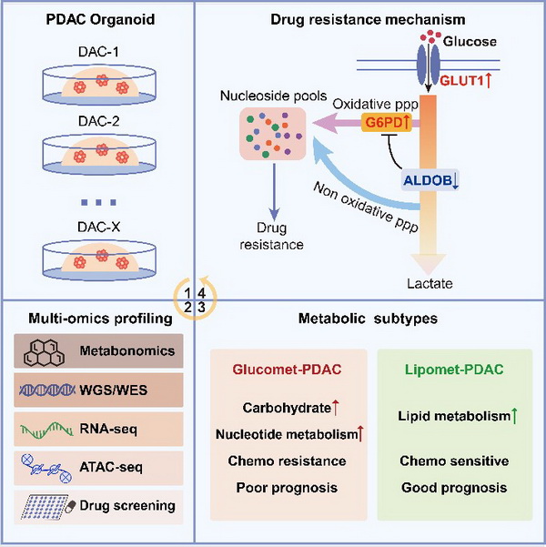 8月18日,国际学术期刊Cell Reports Medicine在线发表了中国科学院分子细胞科学卓越创新中心高栋研究组、陈洛南研究组、杨巍维研究组与海军军医大学第一附属医院(上海长海医院)金钢研究组、中国科学院上海营养与健康研究所尹慧勇研究组的合作研究成果: Metabolic classification suggests GLUT1/ALDOB/G6PD axis as a therapeutic target in chemotherapy-resistant pancreatic cancer。该研究系统性揭示胰腺导管腺癌(PDAC)的代谢组学特征,并通过整合代谢组、全基因组、转录组和药物敏感性等多组学数据提出不同代谢亚型的化疗敏感性机制及潜在治疗靶点。