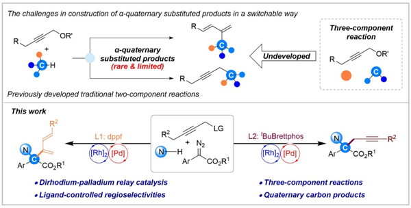 过渡金属催化的炔丙基取代反应被广泛应用于合成一系列含有重要官能团的产物。由于活性炔丙基金属中间体的多种反应性,以可控的方式,从相同的原料获得不同产物的区域发散性炔丙基取代反应仍是一项艰巨的挑战。另外,现阶段发展的炔丙基取代反应主要局限于两组分反应,亲核试剂需要预先制备,一定程度上限制了产物结构的多样性和合成效率。因此,利用多组分反应实现区域发散性的炔丙基取代反应,尤其是构建含有重要官能团的 季碳中心,是重要且挑战性的研究课题。