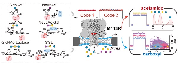 首先,研究团队将纳米孔α-溶血素(α-HL)的敏感位点113位的甲硫氨酸(M)进行了基因工程改造,通过对极性、体积、电荷等氨基酸筛选,获得敏感性、特异性最佳的工程纳米孔M113R。利用该纳米孔清晰地表征了单糖分子中乙酰氨基和羧基两种糖官能团的电流信号,并建立了其结构与电信号对应的指纹图谱。随后,研究团队利用分子动力学模拟和基因突变对糖分子进入该纳米孔中的动态过程进行进一步剖析,明确了纳米孔M113R识别两种官能团的分子机制;基于此,研究团队利用两种官能团的特征电信号进一步绘制了含有乙酰氨基和羧基寡糖的指纹图谱。最后,团队成员利用指纹图谱在糖混合体系中成功识别了含有两种基团的单糖、二糖和三糖。该项技术采用工程改造的纳米孔,无需对糖进行额外化学修饰或桥接。这一概念验证研究为高效建立糖分子指纹图谱库提供重要基础。