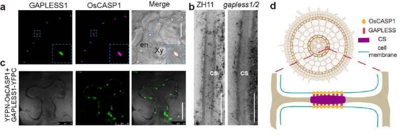 进一步研究发现,GAPLESS特异定位在凯氏带所在的细胞壁,且与凯氏带细胞质膜区特异定位的OsCASP1蛋白共定位或极其接近。一系列的实验证据表明,GAPLESS蛋白能够与OsCASP1发生很强的相互作用,进而形成牢固的GAPLESS-OsCASP复合体。因此,嵌于凯氏带细胞壁的GAPLESS蛋白与镶嵌于细胞质膜的OsCASP通过形成这种稳固的复合体将凯氏带与细胞质膜粘连在一起,进而阻断水分和离子在根部自由扩散。