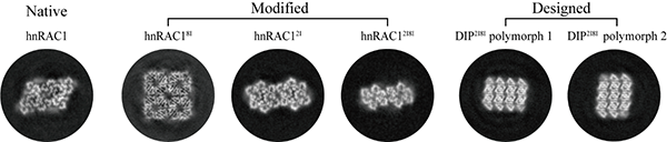 此外,通过在hnRAC1的不同位点引入碘原子修饰,研究人员发现,碘化修饰能诱导hnRAC1形成具有不同原子结构及热稳定性的淀粉样纤维“万花筒”(图1)。进一步的研究发现,这些具有不同结构的多肽淀粉样纤维的自组装是由多肽分子内与分子间形成的各种类型的卤键驱动(表1)。例如,在Phe8的苯环上引入碘原子的hnRAC18I,诱导形成一种分子内C–I 卤素键,从而将肽链锁定在单一的构象中,组装形成的纤维的截面结构为方形。而在周围区域具有柔性较强Gly的Phe2的苯环上引入碘原子的hnRAC12I或在Phe2的苯环和Phe8的苯环上均引入碘原子的hnRAC12I8I,都会形成多个不同类型的分子间卤素键,诱导产生多种肽链构象。hnRAC12I和hnRAC12I8I组装形成的纤维的界面具有类似于花瓣形的结构(图2)。进一步,研究人员基于对hnRAC1和三种不同碘化多肽纤维原子结构与自组装机制的理解,通过理性设计获得了具有全新结构的碘化肽DIP2I8I淀粉样纤维(图2)。
