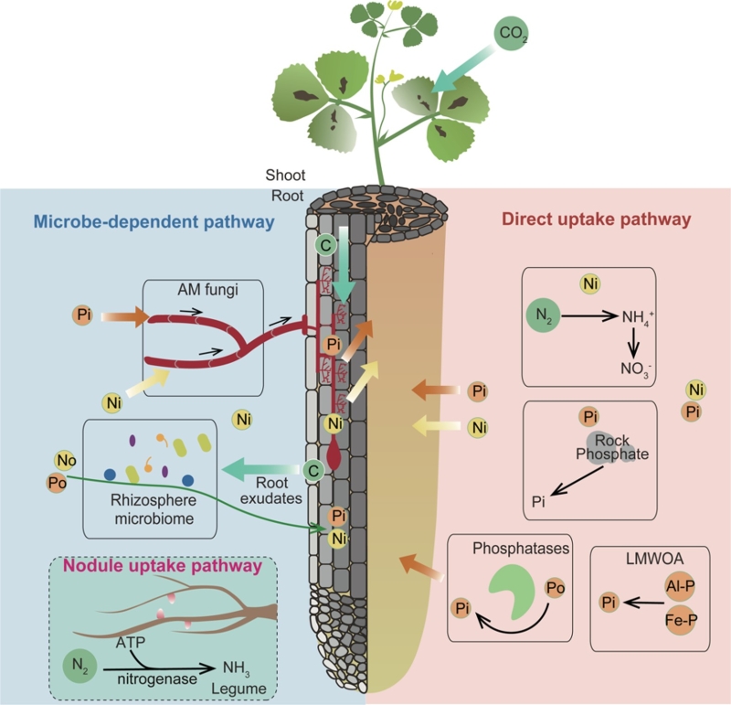图1:植物获取氮、磷的直接和间接吸收途径。