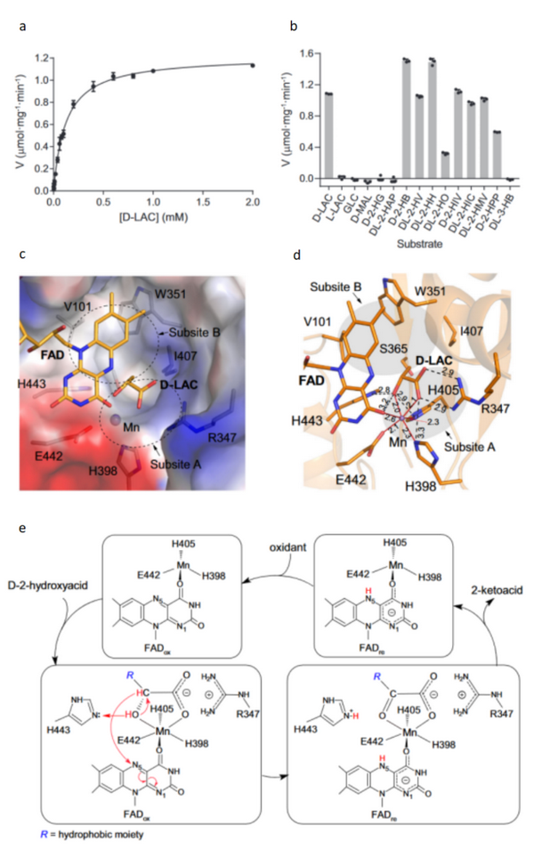 LDHD的酶学性质、活性位点识别底物的结构基础、以及催化反应的分子机制。a. LDHD催化D-LAC的饱和曲线;b. LDHD对不同底物和类似物的催化活性;c. LDHDFAD+Mn+D-LAC结构中底物结合位点的表面电势示意图,底物结合位点由亲水性的subsite A和疏水性的subsite B组成;d. LDHDFAD+Mn+D-LAC结构中D-乳酸、FAD、Mn2+和周围氨基酸残基之间的相互作用关系,氢键相互作用用黑色虚线表示,配位键用红色实线表示;e. LDHD的催化反应机制。