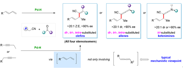 近日,该课题组在国际知名化学期刊Nat. Commun.在线发表了题为 “Asymmetric Formal sp2-Hydrocarbonations of Dienes and Alkynes via Palladium Hydride Catalysis.”的研究论文 (Nat. Commun. 2023, 14, 6303.)。该工作通过钯氢催化的不对称氢烷基化和Wittig反应串联策略,实现了共轭二烯和炔烃底物的形式氢烯化、氢联烯化、氢氮杂联烯化过程,从而在不饱和烃上引入二、三、四取代烯烃,二、三、四取代联烯,以及三取代氮杂联烯片段,为含高pKa C-H的sp2碳参与的不对称氢官能团化提供了一条间接的思路(图1)。该工作突破了传统所认为的炔烃参与的氢官能团化只经历联烯中间体的观点,指出在当前的反应体系中炔烃底物也同时经历了共轭二烯的形成。这对于炔烃转化机制的认识是一个很好的补充。