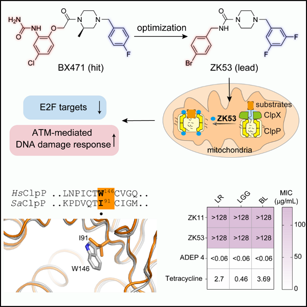 本研究利用高通量筛选发现趋化因子受体CCR1拮抗剂BX471可以选择性激动 HsClpP。结构优化之后获得一类具有柔性骨架的 HsClpP激动剂,其中化合物ZK53能够结合 HsClpP并激动其酶学活性。 HsClpP/ZK53的复合物晶体结构揭示了小分子的作用机制。与已报导的大多具有刚性骨架结构的 HsClpP激动剂不同,ZK53不具有ONC201的多环并环结构,也没有ADEP4中复杂的环肽类骨架,而是以结构简单的柔性六元环为基础,支撑两部分“边臂”与 HsClpP蛋白结合。在选择性上,ZK53不结合也不激动金黄色葡萄球菌 SaClpP、大肠杆菌 EcClpP和罗伊斯乳杆菌 LrClpP,不影响肠道菌群的体外生长。通过序列比对与蛋白突变实验发现,选择性产生的原理是由于 HsClpP中146位色氨酸与ZK53的3,5-二氟苯基产生了 - 堆积作用,稳定了ZK53与HsClpP的结合,而细菌蛋白中该位置为体积较小的氨基酸,削弱了该作用,进而降低了ZK53与细菌ClpP的结合能力。ZK53的发现为设计 HsClpP选择性激动剂提供了一种新的机制和策略。
