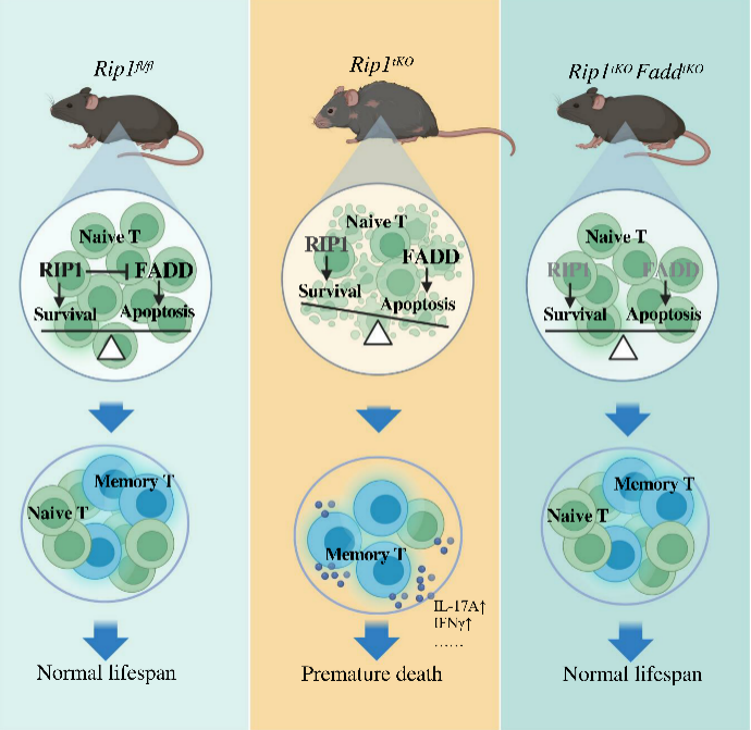 Receptor-Interacting Protein Kinase 1(RIP1/RIPK1)是决定细胞死亡与存活的关键调控蛋白,研究人员通过构建T细胞特异性敲除RIP1基因的小鼠(Rip1tKO),发现Rip1tKO小鼠相对于同龄的野生型小鼠,呈现出系统性的早衰特征,包括过度的炎症,弓背,毛发稀疏,身体机能下降,骨质疏松、肌少症等多种与年龄相关的表型,同时行为及认知能力出现显著下降,寿命也较野生型小鼠显著缩短。机制研究发现RIP1的缺失导致T细胞的凋亡增加,并促进T细胞向TH1和TH17亚型分化,诱导组织器官炎症水平增高,进一步促进组织器官衰老标志物表达升高。通过在Rip1tKO小鼠的基础上进一步构建Fadd基因敲除的小鼠阻断T细胞的凋亡,发现FaddtKORip1tKO双基因敲除小鼠能够恢复外周原始T细胞以及记忆T细胞稳态平衡,并能逆转Rip1tKo小鼠的胸腺萎缩以及全身系统性的早衰表型,同时延长Rip1tKo小鼠的寿命至野生型小鼠水平,而阻断T细胞的程序性坏死小鼠(Rip1tKoRip3-/-和Rip1tKoMlkl-/-)却仍表现出与Rip1tKo小鼠相似的系统性衰老表型,提示Rip1tKO小鼠是T细胞过度凋亡导致外周原始T细胞的减少以及记忆T细胞的比例增加,促进了组织的炎症水平升高及组织细胞衰老,最终导致个体全身系统性的早衰发生。