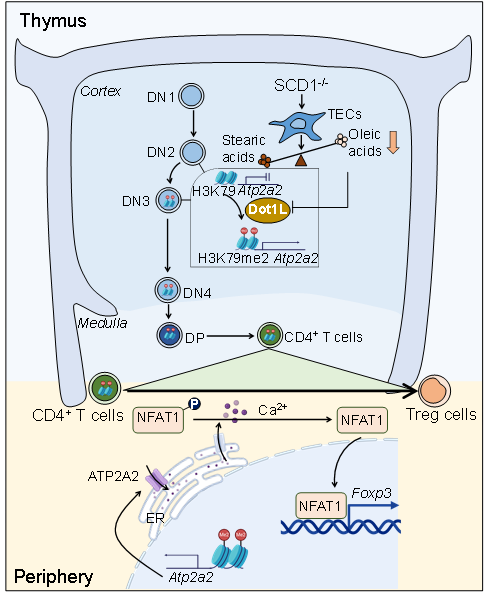 硬脂酰辅酶A去饱和酶(stearoyl CoA desaturase, SCD)是催化来源于食物或者从头合成的饱和脂肪酸转变为单不饱和脂肪酸(油酸与棕榈油酸)的限速酶。其中,人类基因组中的2个SCD基因均与小鼠SCD1基因高度同源。研究发现,SCD1缺失显著促进小鼠外周血、淋巴结以及主要组织器官中Foxp3+ Treg的数量与比例,并赋予其抵抗自身免疫性疾病的能力,这一现象与SCD1缺失促进初始CD4+ T细胞向Treg分化密切相关。利用条件性敲除小鼠、骨髓移植、胸腺移植和T细胞体外发育等体系,研究揭示SCD1在胸腺上皮细胞中的缺失是导致初始CD4+ T细胞向Treg的分化倾向性增加的主要原因,而非SCD1在T细胞中缺失所引起。更为重要的是,胸腺上皮细胞油酸的可利用性影响初始CD4+T 细胞向Treg分化潜能的关键窗口期是胸腺细胞DN2向DN3的发育阶段。在油酸缺乏的胸腺微环境中,胸腺细胞内表观遗传修饰酶DOT1L活性上调,借以H3K79me2修饰促进DN3胸腺细胞中Atp2a2基因座的染色质开放水平。这一表观遗传学印记从DN3阶段一直保留至初始CD4+ T细胞,使其在接受T细胞受体激活信号时,通过ATP2A2——calcium——NFAT——Foxp3信号轴促进其向Treg分化。该项研究首次揭示胸腺基质微环境中的油酸信号影响和预编程外周T细胞亚群分化偏好性的细胞与分子机制,不仅为理解不同生理病理环境中T细胞免疫调控机制提供了新视角,也为Treg的定向高效诱导及其在器官移植、自身免疫性疾病等治疗中的应用提供新策略与新方向。