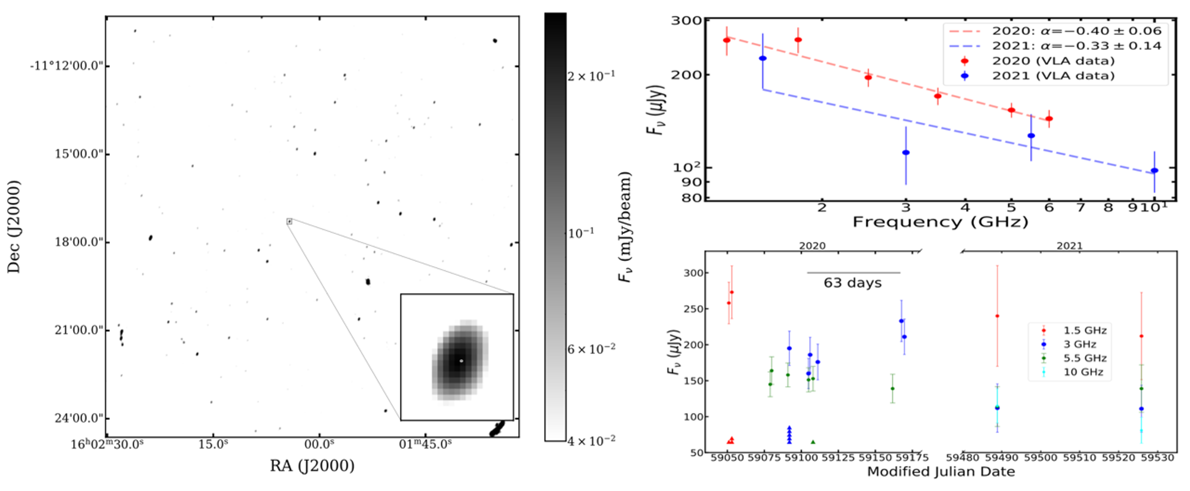 图1. 左图:FRB 20190520B的持续射电源1.5 GHz的VLA深度图像,包括射电暴位置(左图右下角插图中白点)和持续射电源。右上图:持续射电源的2020-2021射电谱演化和持续射电源宽频段流量显著下降(约20%)。右下图:持续射电源的射电多频段光变曲线。(图片来自中国科学院上海天文台观测高能课题组,参考Zhang et al. 2023, ApJ)