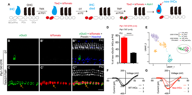 图1:A.内毛细胞损伤再生的示意图;B.内毛细胞损伤小鼠模型可以高效特异的损伤内毛细胞;C.在内毛细胞损伤的情况下,异位表达Atoh1与Tbx2可再生出vGlut3+的新生内毛细胞;D.损伤情况下的再生毛细胞效率显著提高;E.转录组水平上,新生毛细胞与野生型P30内毛细胞聚为一群;F-G.新生内毛细胞的电压依赖的Ca电流与野生型内毛细胞相似。