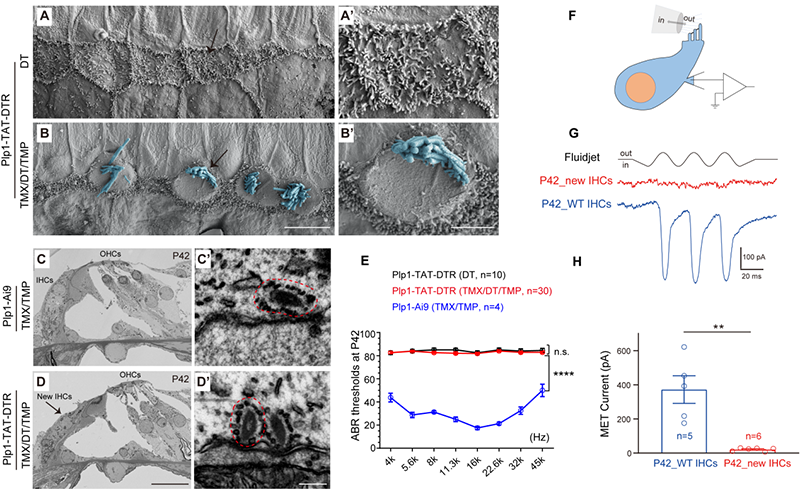 图2.A-B.扫描电镜可观察到在内源内毛细胞损伤的情况下,新生内毛细胞可再生出新的纤毛结构;C-D.透射电镜可观察到新生内毛细胞有囊泡结构的产生;E.但小鼠听力未能得到有效的改善;F-H.电生理技术发现新的内毛细胞不具备机械敏感的MET通道电流。