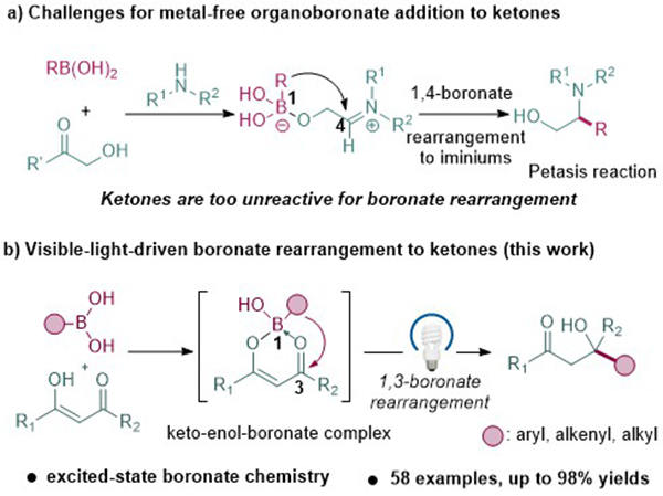 最近,中国科学院上海有机化学研究所陈以昀课题组报道了第一例1,3-硼迁移至酮的可见光驱动反应,并与郑州大学蓝宇课题组合作对激发态的四配位硼酸盐重排机理进行了研究,排除了自由基反应途径。该反应原位生成烯醇酮螯合的四配位硼复合物,在可见光驱动下跃迁至激发态促进了区域选择性的1,3-硼迁移反应合成各种 -羰基叔醇化合物(Angew. Chem. Int. Ed. 2023, e202316481)。