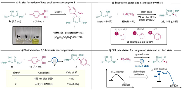 在过去的几年中,陈以昀课题组系统性研究了各种酮类和有机硼酸形成的有机四配位硼络合物,发现1,3-二酮1a互变异构产生的烯醇酮与芳基硼酸1b混合可以迅速变色生成全新的烯醇酮螯合的四配位硼复合物(图2a)。该四配位硼复合物在蓝光区有明显吸收,经过蓝灯照射后可以得到区域选择性1,3-硼迁移的 -羰基叔醇产物3(图2b)。由于新形成的硼酸盐复合物在蓝光区有明显吸收,他们进一步探索了激发态化学反应过程。该反应对于不同电子特性的芳基硼酸,烯基硼酸和烷基硼酸均能高效进行,并具有优秀的化学选择性与官能团兼容性,反应产率可以高达98%,同时也证明了光反应容易放大到克级反应(图2c)。