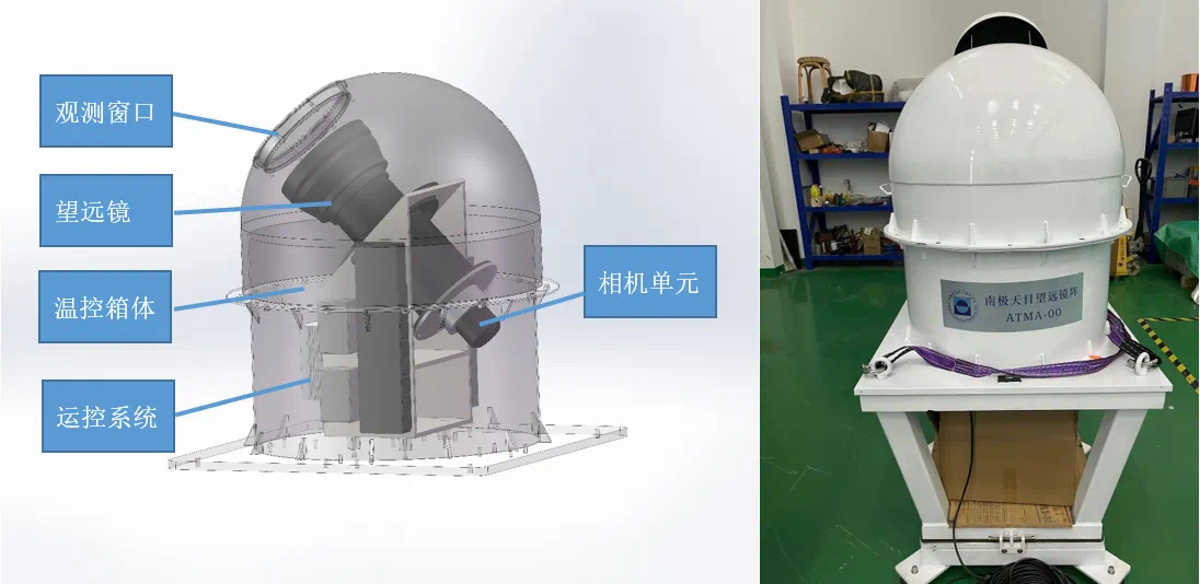 设计思路是将望远镜系统所有设备放置在密封及隔热性能优良的可控温圆顶内,利用漂移扫描技术实现观测,借助卫星通讯实现上海控制端与南极设备端之间的信息传输。这样的一体式结构设计思路具有显著的技术创新性,整个系统无需驱动,无需拆装,可整体运输,安装调试简单便捷,快速就能开展观测,不但能提高系统的可靠性和安全性,同时也极大方便了在南极的调试与安装。“该原型机是上海天文台放置在南极的首个观测设备,也是我国首台基于漂移扫描CCD技术的南极天文观测设备。”项目负责人、上海天文台正高级工程师周丹表示,“该设备观测技术独特,环境适应性强,自动化程度、可靠性、能源利用率都比较高,且研制和运行成本低。通过在中山站实际观测调试和数据分析,可为未来分期布设望远镜阵,最终实现南极天目计划提供重要参考依据。”