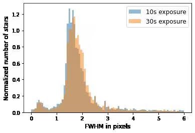 星象像质测试,半高全宽(FWHM)分布在曝光10秒、30秒情况下,FWHM分布在1.2至2.5个像素之间,与实验室测试数据保持一致。