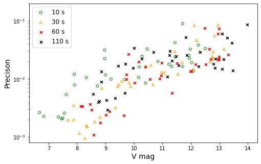 不同曝光时间所拍摄的星的光变曲线精度。曝光30秒的情况下亮于9等的星的精度可以达到千分之一左右(x轴为V星等,y轴为光变曲线的RMS)