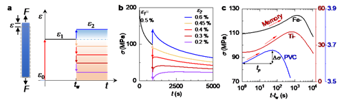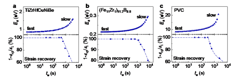 图4 预加载应力松弛呈现双阶段,短时间为可逆弛豫具有较小的激活能,为 弛豫过程;长时间为不可逆弛豫的协同运动过程,具有较大的激活能