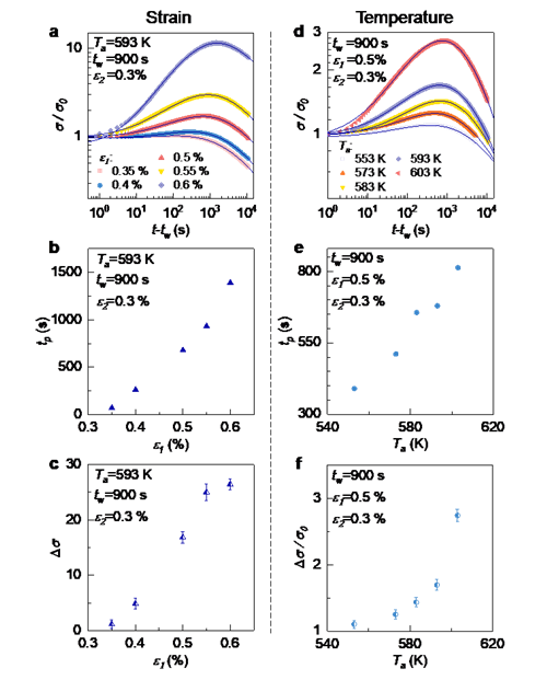 图2 更大的预加载应变及温度都会促进应力记忆效应,具有更大记忆效应峰值时间tp和强度
