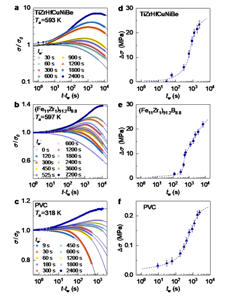 图3 在三种玻璃材料中均观察到记忆效应随预加载时间tw呈现双阶段演化特征:即在较短的预加载时间内,记忆效应表现较为微弱;当预加载时间超过某一特定阈值后,记忆效应会迅速增强,达到相对较大的数值