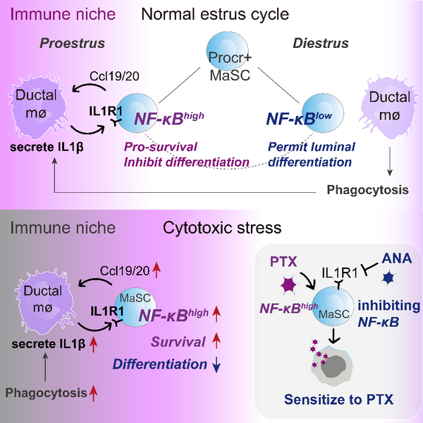 研究人员首先发现了在生理周期中,由于乳腺组织的微环境中发生的细胞凋亡的增多和减少,会引起有节律地、反复地自限性炎症规律。通过单细胞转录组分析、体外共培养实验、体内谱系示踪实验和遗传学基因敲除实验,研究人员发现细胞凋亡引起组织驻留的CD11c+巨噬细胞的激活,分泌IL1 ,从而激活Procr+干细胞的IL1R1-NF- B信号通路活性。微环境中的细胞凋亡增多时,组织中的Procr+干细胞的NF- B信号通路活性上调,一方面促进生存,另一方面抑制分化。相反,微环境中的细胞凋亡减少时,Procr+干细胞的NF- B信号通路下调,干细胞启动分化程序,产生后代细胞,表现为产生更高比例的管腔细胞 (管腔细胞在生理周期的形态变化中更容易发生凋亡和被损耗)。在正常生理状态下,组织干细胞随着生理周期的节律进行周期性地NF- B信号通路活性震荡,产生的后代细胞贡献于组织器官的稳态维持和再生。在病理状态下,例如在使用化疗药物紫杉醇时,组织中更多的细胞死亡,引起CD11c+巨噬细胞活动增加,其与Procr+干细胞的交流增强,赋予了干细胞更强的存活能力,即干细胞在细胞毒性应激条件下存活,表现为化疗耐药性。最后,研究人员使用小分子化合物抑制IL1R1,可以阻断巨噬细胞与干细胞的互作,降低干细胞在应激条件下的NF- B活性,提高了干细胞对紫杉醇治疗的敏感性。