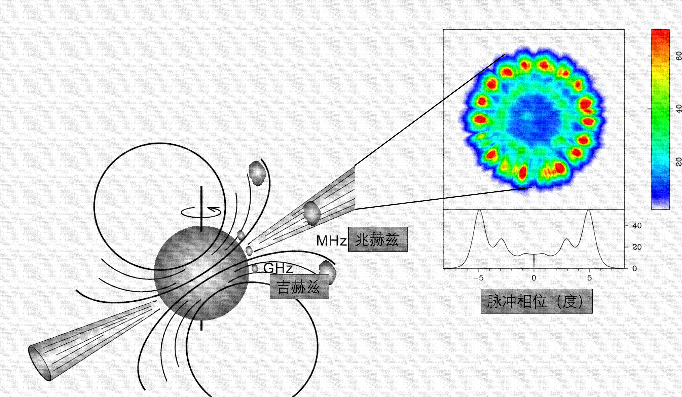 图1,脉冲星(含磁星)辐射示意图:脉冲星就如快速旋转的灯塔,起源于其磁场两极的“束状”辐射每扫过观测者一次便可探测到一个脉冲;脉冲轮廓形状为其辐射束子结构的直观反映,通常认为高频比低频辐射更靠近星体表面。(该图在Yogesh Maan & Avinash A. Deshpande和John H. Seiradakis & Richard Wielebinski示意图基础上综合加工而成)