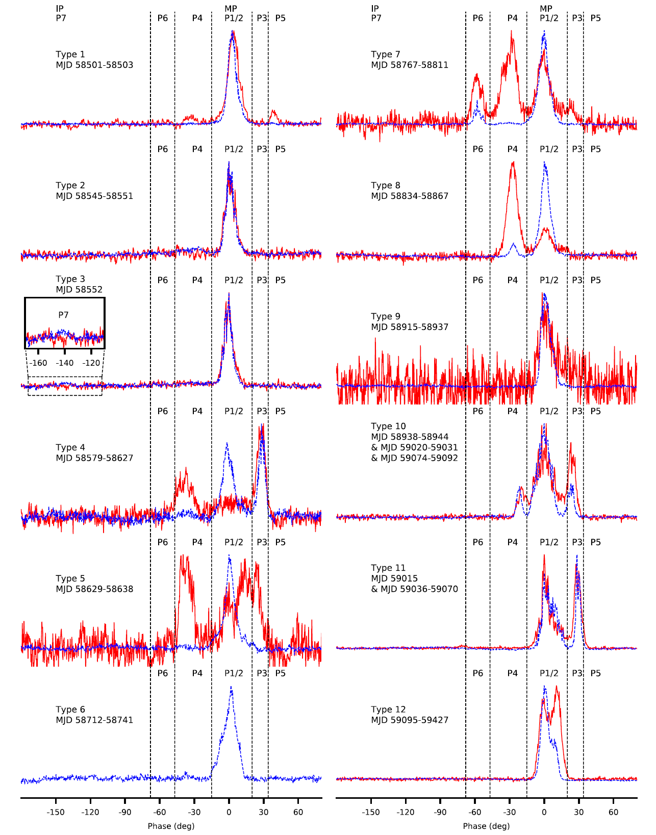 图2,XTE J1810-197在2.25/8.60 GHz(红/蓝)12类典型平均轮廓,其中P1/2两个辐射成分一直处于辐射状态,其它辐射成分“时开时关”,而且2.25和8.60 GHz两个频率的辐射变换并不一定同步。