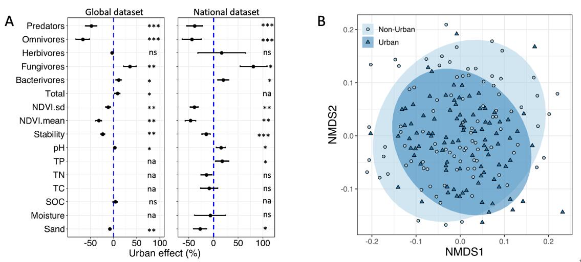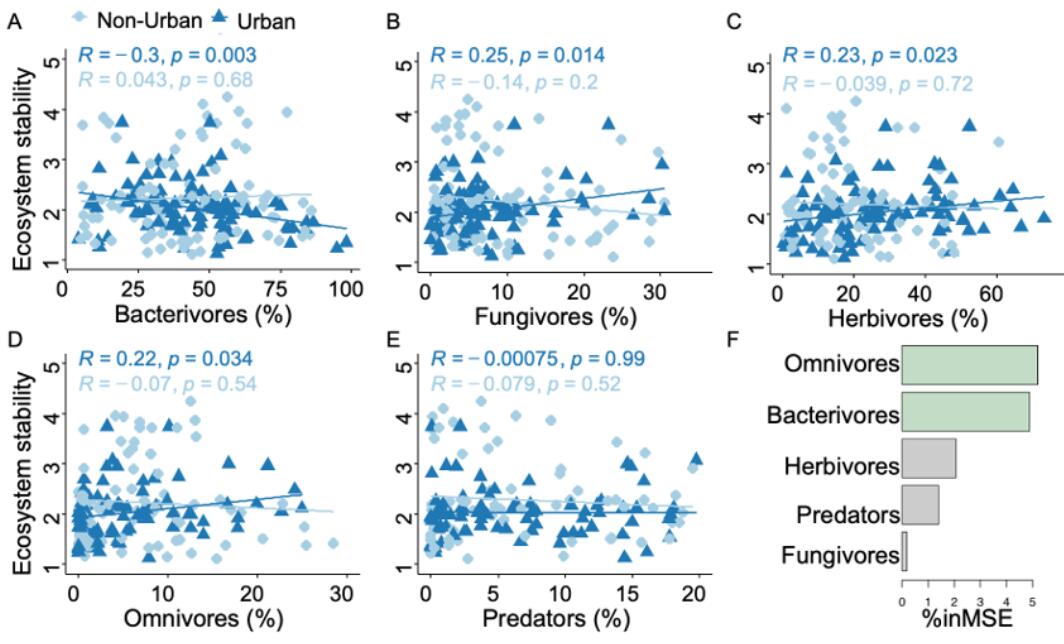 基于此,中国科学院城市环境研究所朱永官院士团队孙新研究组在中国12个城市对城市-城郊的土壤线虫功能群相对数量与生态系统稳定性的关系进行了调查研究。同时也对相关结论进行了全球尺度数据的验证。结果表明,城市化降低了土壤杂食性和捕食性线虫的相对数量,同时增加了食细菌和食真菌线虫的相对数量 (图1a),并使其群落结构更加同质化(图1b)。相对城郊土壤,仅城市食细菌、食真菌、植食性和杂食性土壤线虫相对数量与生态系统稳定性的关系呈现显著,并且杂食性和食细菌线虫是生态系统稳定性的主要贡献因子(图2)。因此本研究强调,在制定城市土壤生物多样性保护战略时,需考虑不同功能群的特点,增加生境的多样性,同时也需要优先制定高营养类群的保护措施,特别是杂食性的类群。