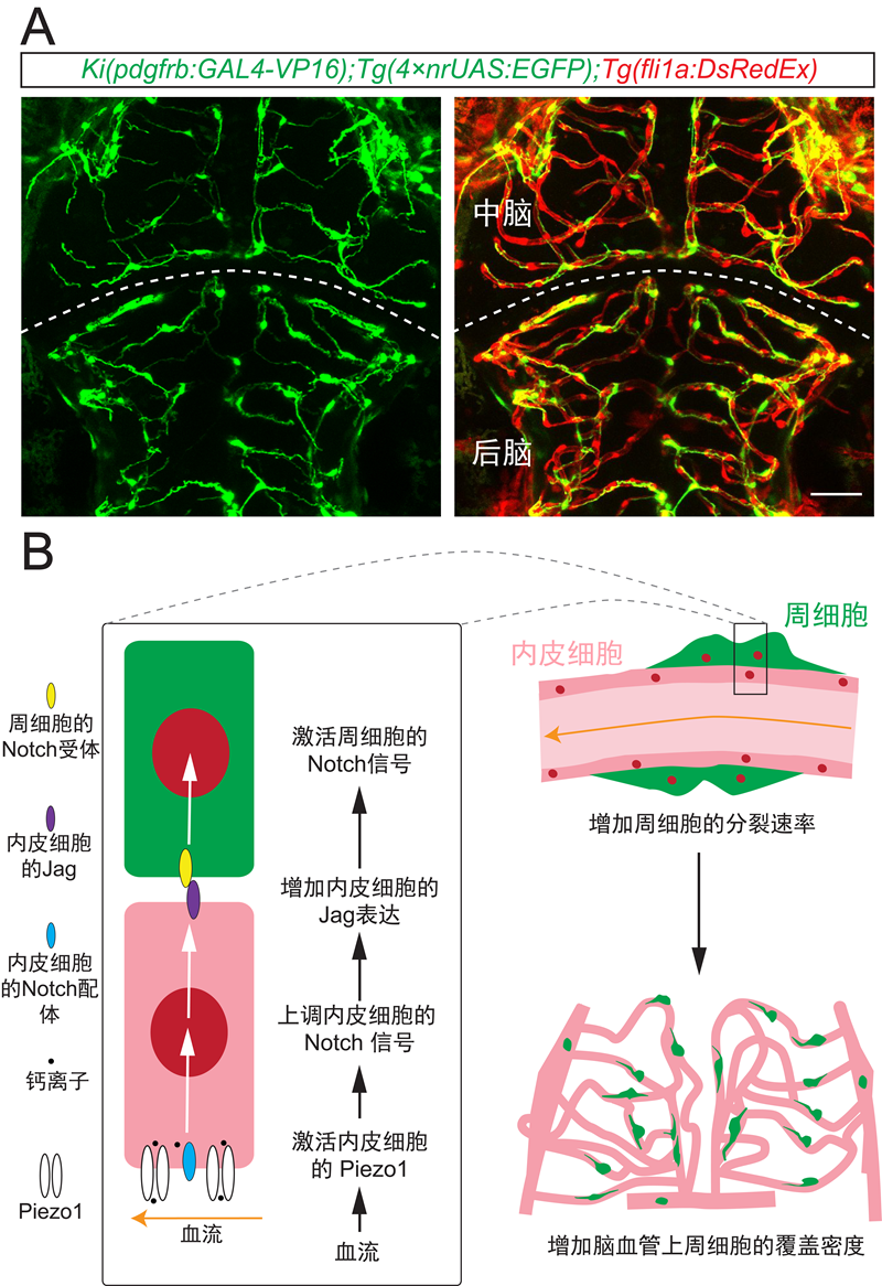 A. 斑马鱼胚胎大脑血管(红色)和周细胞(绿色)的在体成像。B. 血流调节大脑周细胞发育的机制模式图。血流激活血管内皮细胞的Piezo1,引起内皮细胞Notch信号的上调,促使血管内皮细胞表达更多的Notch配体Jag,进而激活周细胞中的Notch信号,最终促进大脑周细胞的分裂,增加其对脑血管的覆盖。