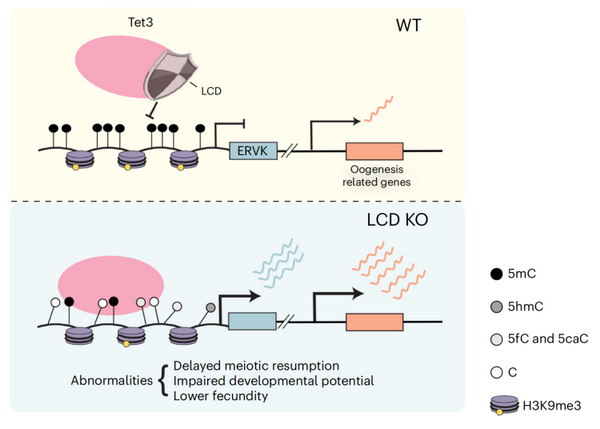 在该项研究中,研究人员发现LCD缺失的Tet3突变体的酶活显著增强。不同于以往对于Tet蛋白的研究局限于功能丧失的方法,研究人员利用独到的基于孤雄单倍体干细胞技术的基因编辑策略,构建了酶活增强的小鼠模型,发现卵子发生过程中Tet3的酶活受到精密调控:在野生型小鼠中,Tet3从卵母细胞时期就开始高表达,但其功能在卵子发生过程中受到抑制,受精之后才开始发挥其氧化去甲基化的功能;而卵母细胞中LCD的缺失解除了Tet3的酶活自抑制,使小鼠卵母细胞基因组5mC发生过度氧化。进一步研究发现,Tet3 LCD突变蛋白倾向作用于原本高度甲基化的ERVK元件和母本印迹基因,且5mC高级氧化产物的产生伴随着H3K9me3水平的降低,从而解除了对ERVK等逆转座元件的双重抑制,影响了ERVK附近卵子发生相关基因的表达,最终导致卵母细胞及后续胚胎发育受损。该研究揭示了位于蛋白催化活性中心的低复杂度结构域LCD对Tet酶活的调控方式和生物学意义,拓宽了人们对Tet酶活时空特异性调控的理解。