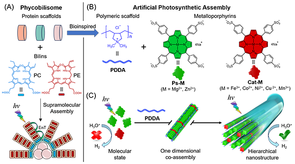 藻胆体(phycobilisome)是蓝细菌和红藻光合系统的关键结构,其通过蛋白骨架定位色素团分子(bilins)高效地捕获光能并传递到光系统I/II及反应中心,进而实现光能到化学能转化。利用超分子组装策略模拟光合细菌或藻类的光捕获及反应中心结构对探索新型人工光合系统具有重要意义,其核心是构建人工骨架来模拟载脂蛋白控制色素分子的空间排列,进而实现光捕获和光反应的高效耦合。藻胆体是典型的天然光合组装结构,为新型超分子人工光合系统的构筑提供了重要思路。中国科学院上海有机化学研究所田佳研究员一直致力于构建人工光合组装体系统以实现光能向化学能的高效转化与储存(Mater. Futures 2022, 1, 042104),于2023年报道了首例仿光合紫菌色素体构筑的有机超分子人工光合组装体用于水相常温高效CO2还原(Nat. Catal. 2023, 6, 464–475)。