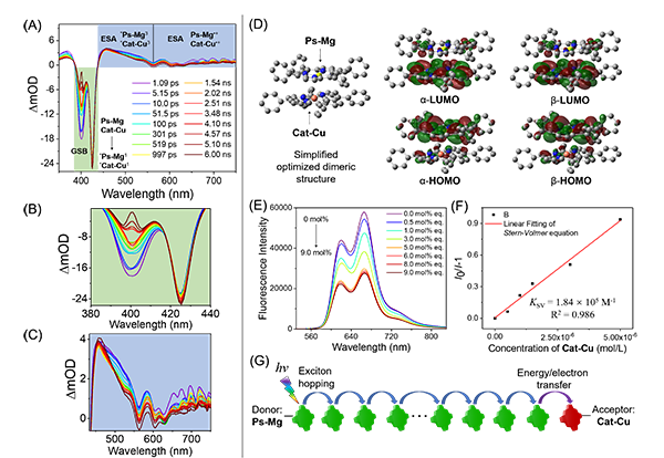 该工作受蓝细菌藻胆体启发,人工组装体结构通过聚电解质PDDA模拟蛋白质骨架的同时利用金属卟啉模拟色素团分子得以实现。在水中,阳离子型PDDA与具有光敏和催化功能的阴离子型金属卟啉共组装生成一维光合组装体,从而模拟藻胆体棒状天线结构和催化中心(图1)。该光合组装结构可实现水相光催化产H2,其效率相比单体分子提升23倍以上。通过形成纳米组装结构,光敏和催化金属卟啉的光稳定性相对单体结构显著提升。研究人员进一步借助瞬态吸收光谱、荧光光谱和理论计算研究了光催化机制(图2)。光照后,研究人员通过飞秒级瞬态吸收光谱观察到有金属卟啉阳离子自由基生成,说明可能存在光诱导的电子转移过程;理论计算同时支持镁卟啉与铜卟啉之间通过电子转移生成电荷分离态。此外,荧光光谱和瞬态吸收光谱实验也支持光合组装体内存在能量转移过程。因此,该仿生组装体系统中的光敏金属卟啉可以通过能量转移和电子转移协同过程使光能从光敏剂传递至光催化中心,从而实现了高效的水相光催化质子还原产H2。通过优化光催化条件,该组装体的光催化产H2性能显著优于其它金属卟啉组装体系。光照下,此光合组装体的产氢速率和转化数(TON)可达51,776 mol h-1 g-1和1299。该研究不仅加深了对天然藻胆体光合作用结构与机制的理解,而且为构筑水相仿生超分子光合组装体系统提供了新的思路。