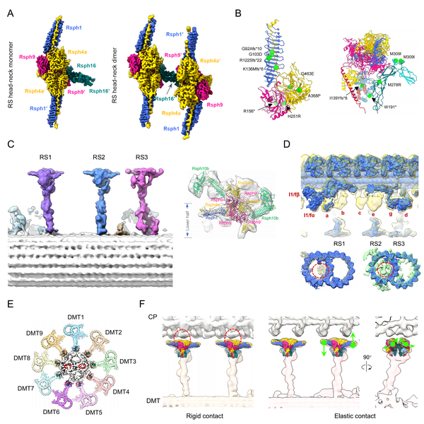 图(A)鼠源RS head-neck复合体的单体(monomer)和二聚体(dimer)的冷冻电镜结构。(B)已知引起PCD及弱精症的突变(绿色球表示)在原子模型上的位置。(C)脑室管膜纤毛的cryo-ET原位结构(左),及RS3头部的结构模型(右)。(D)脑室管膜纤毛结构(蓝色)的组织特异性。相比于呼吸道纤毛(黄色)和精子鞭毛(绿色),其IDA-b/c/e及其微管二连体的A管内Tektin纤维缺失。(E)脑室管膜纤毛轴丝的多尺度结构。(F)提出的“RS-CP”之间的相互作用模式。